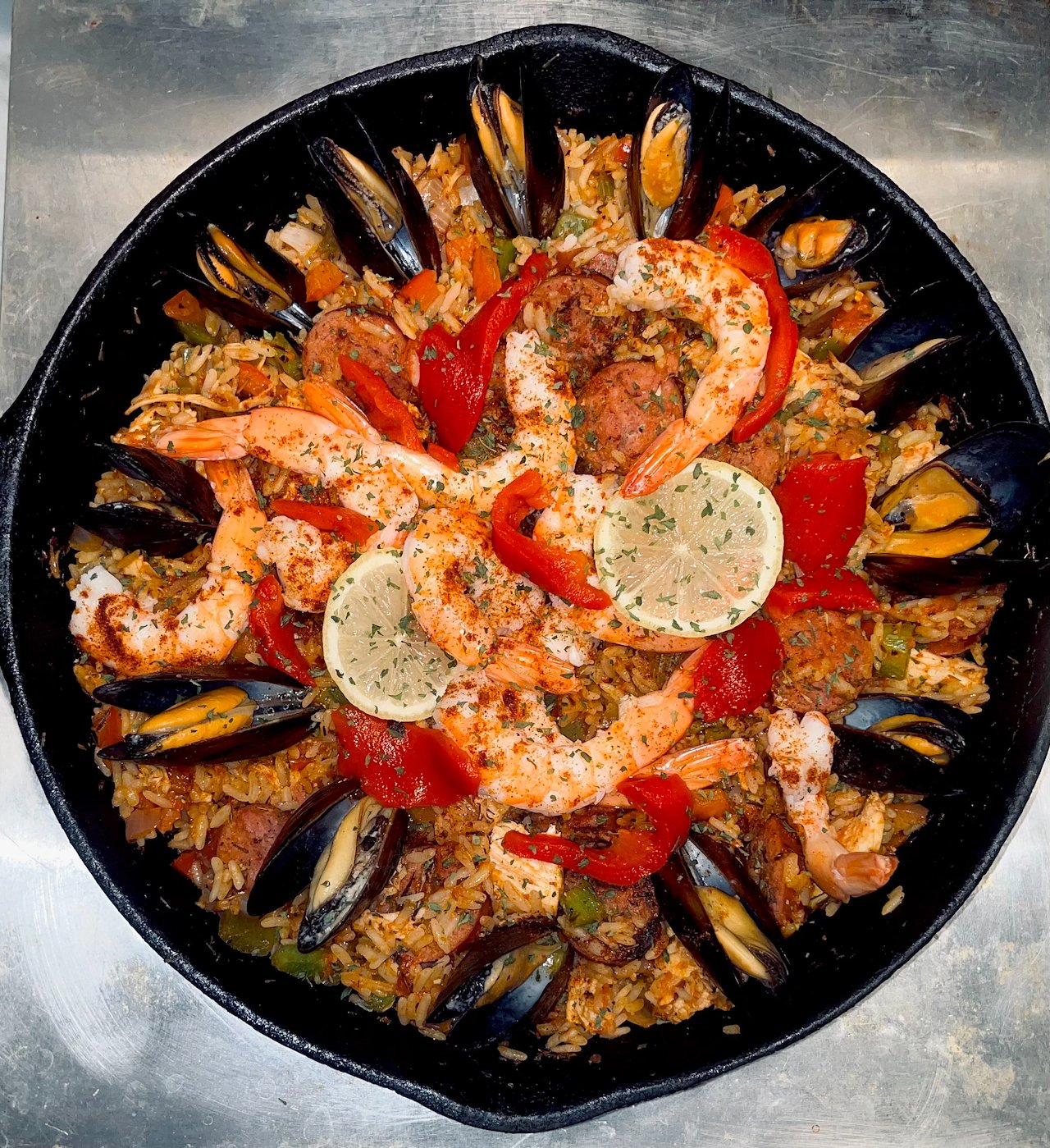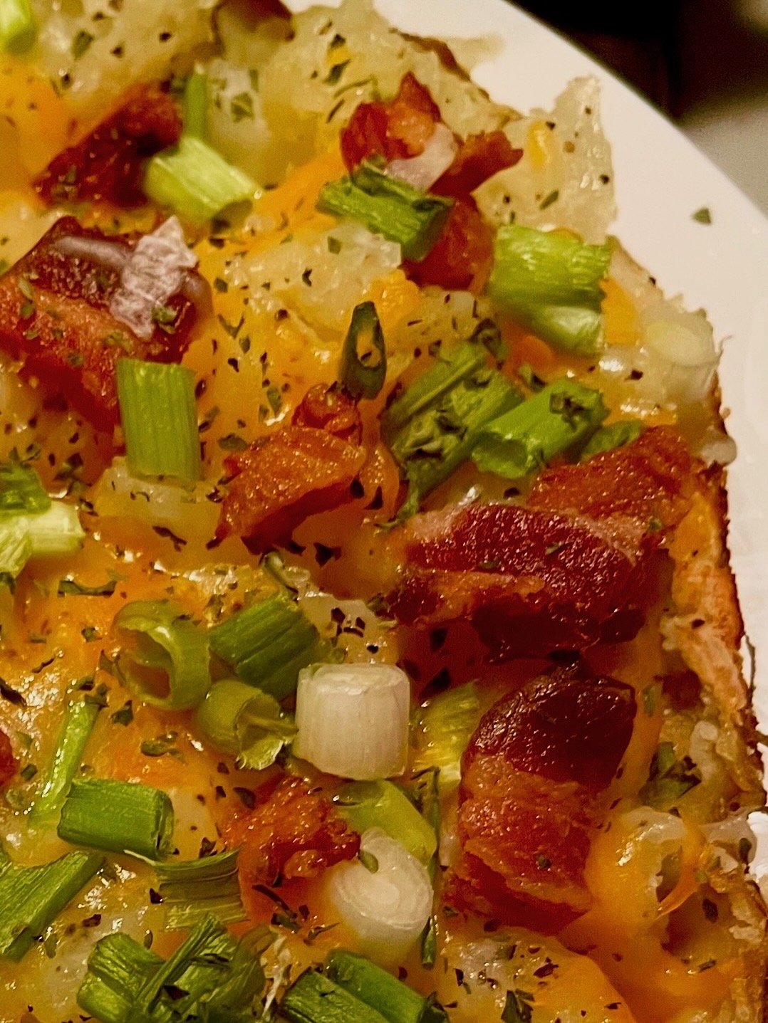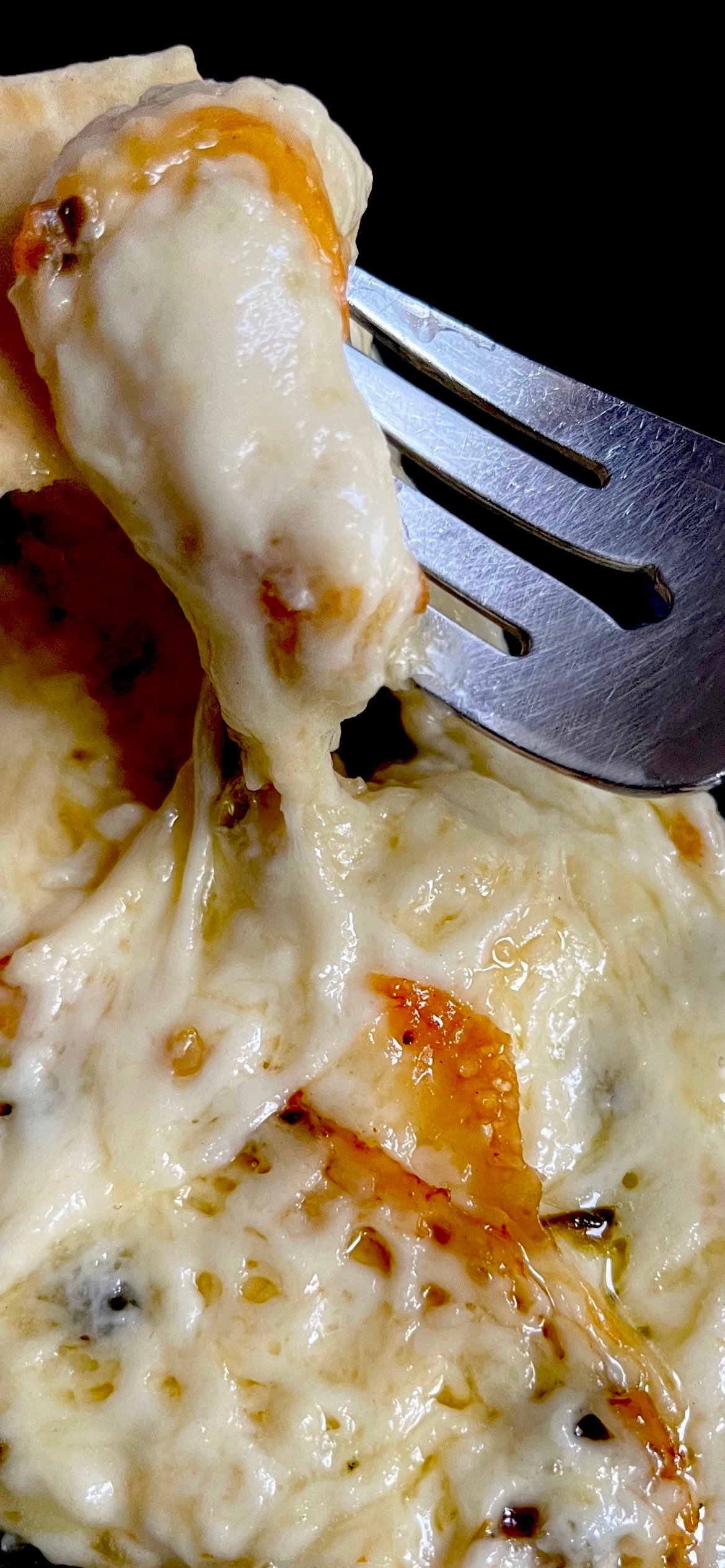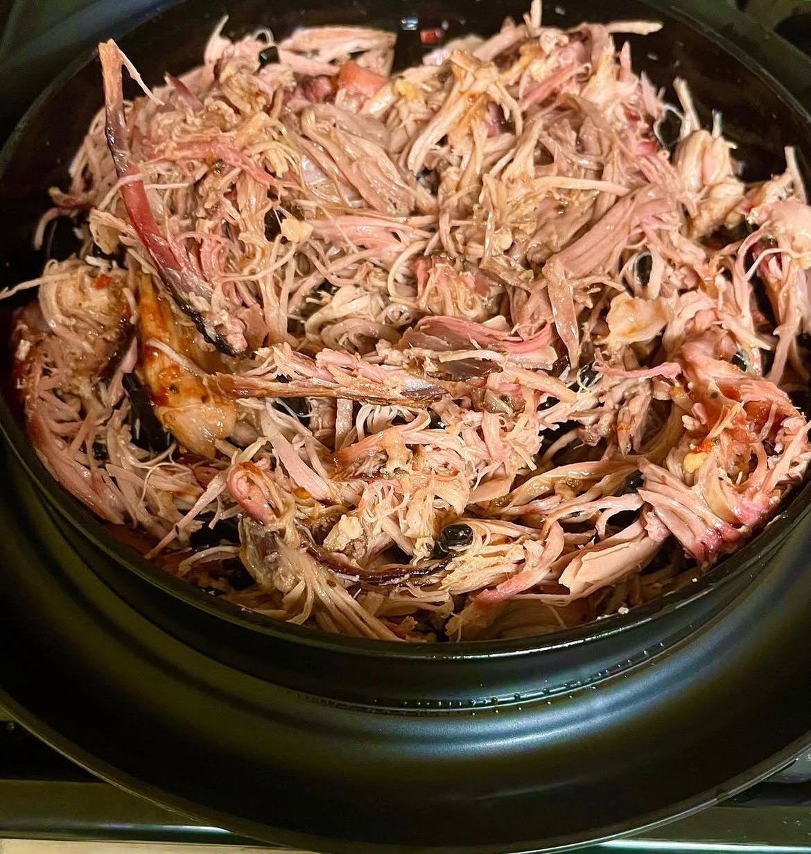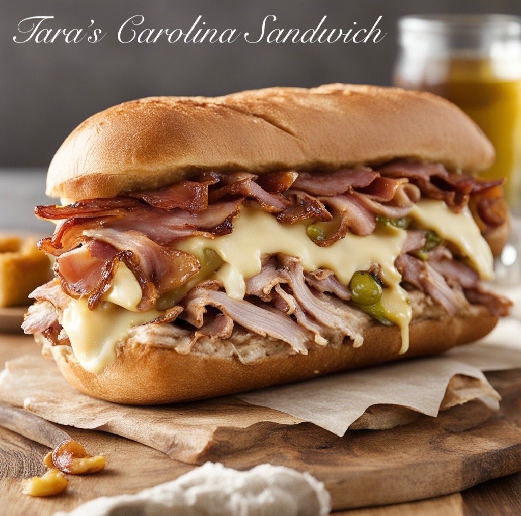 North Carolina smoked pulled pork, pepper bacon, Monterey Jack, melted onions, pickled peppers and Carolina Gold BBQ sauce