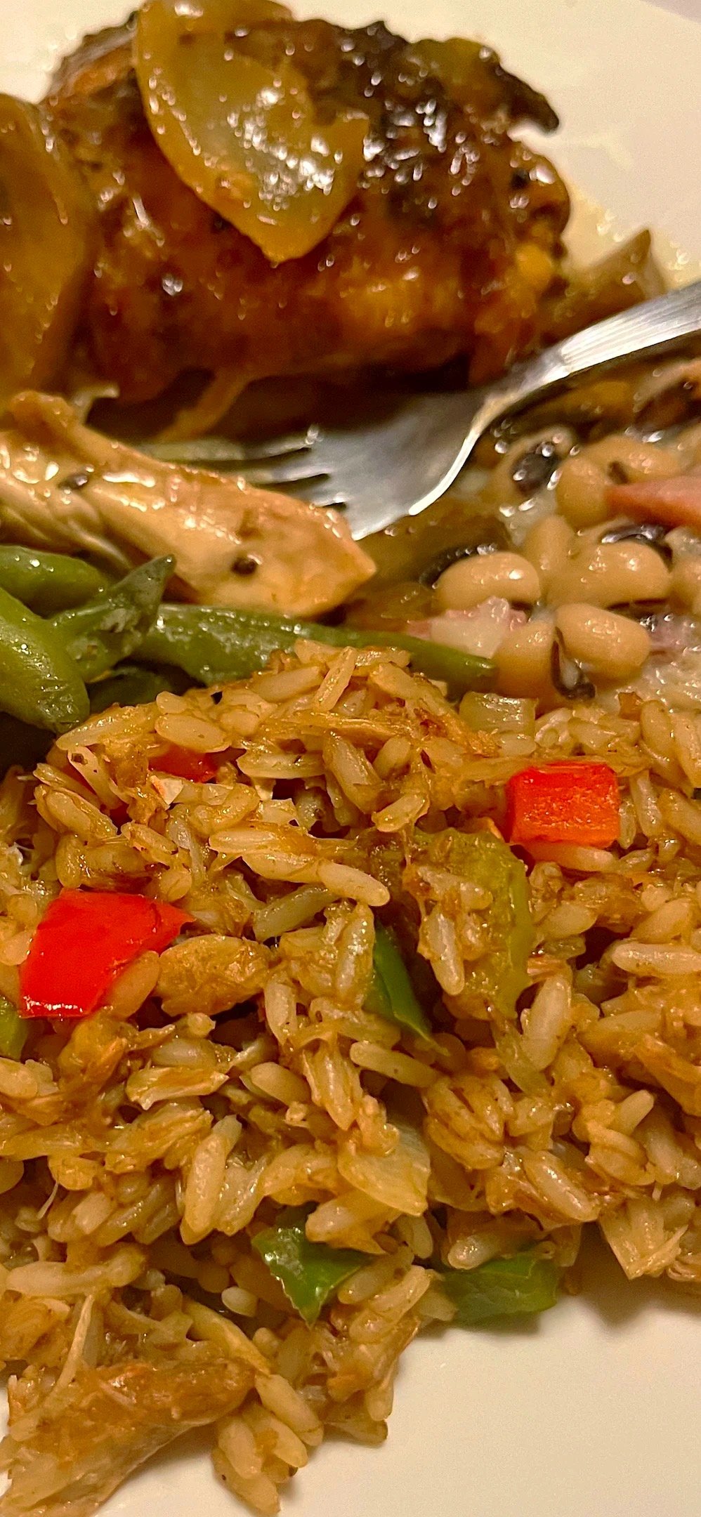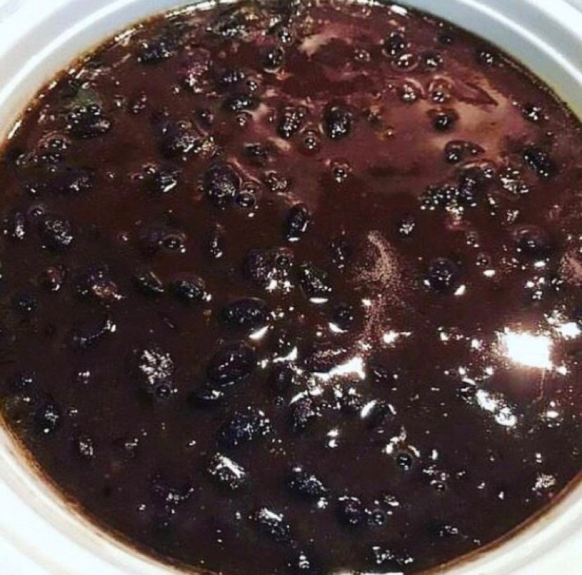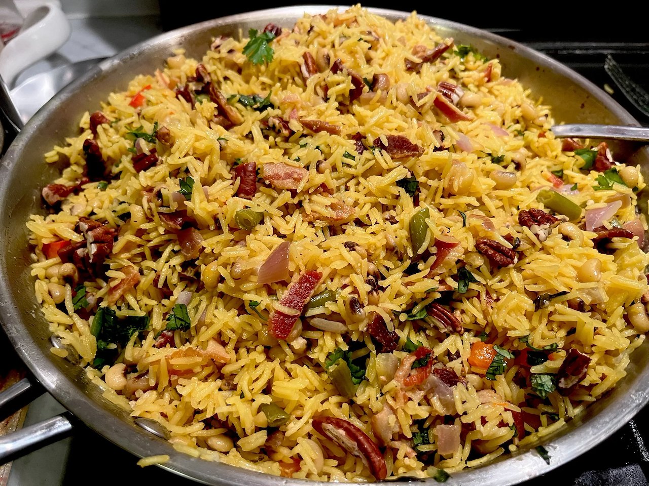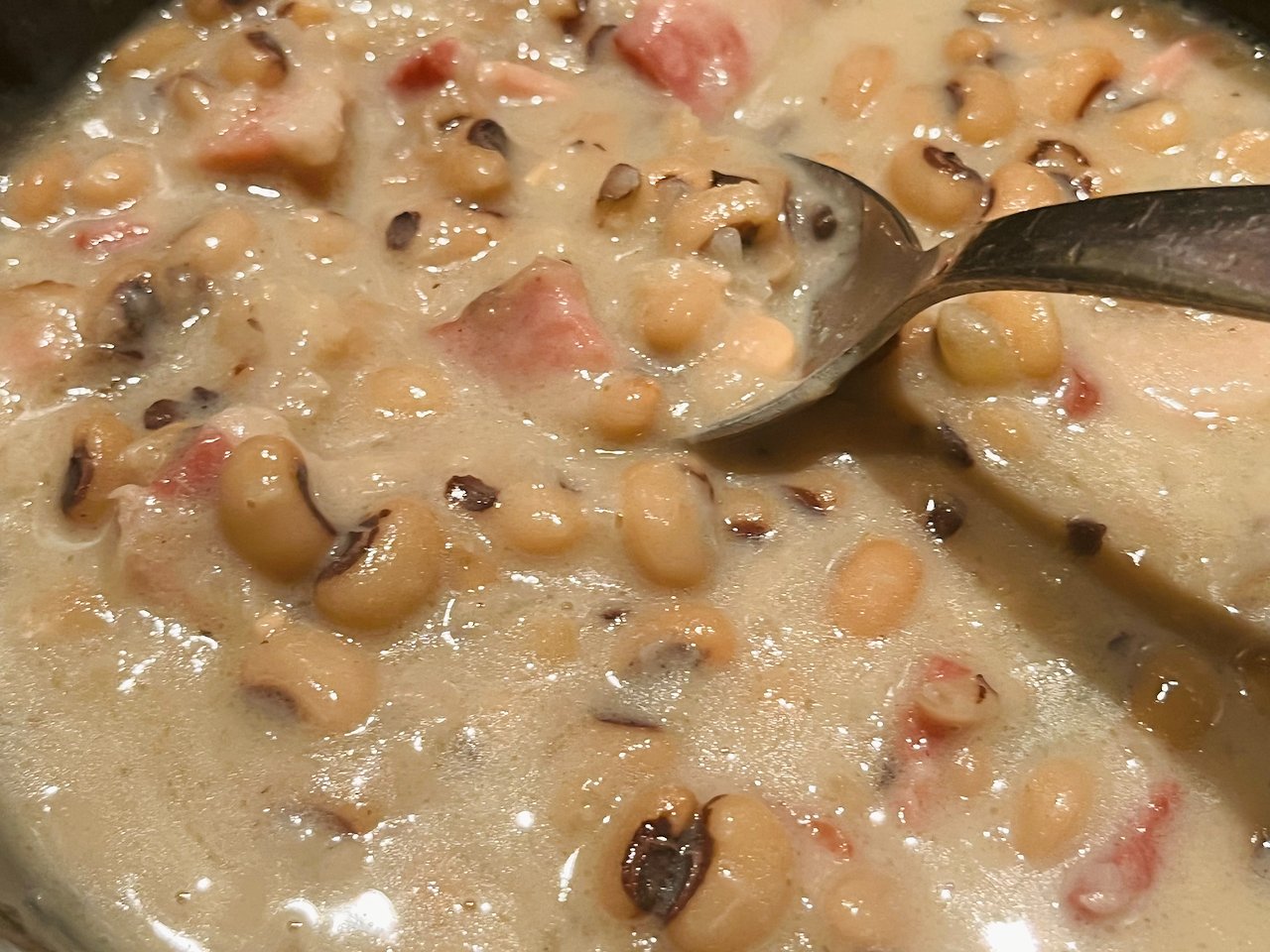 Stewed Black-Eyed Peas in Coconut Milk with Slab Bacon and Vidalia Onions