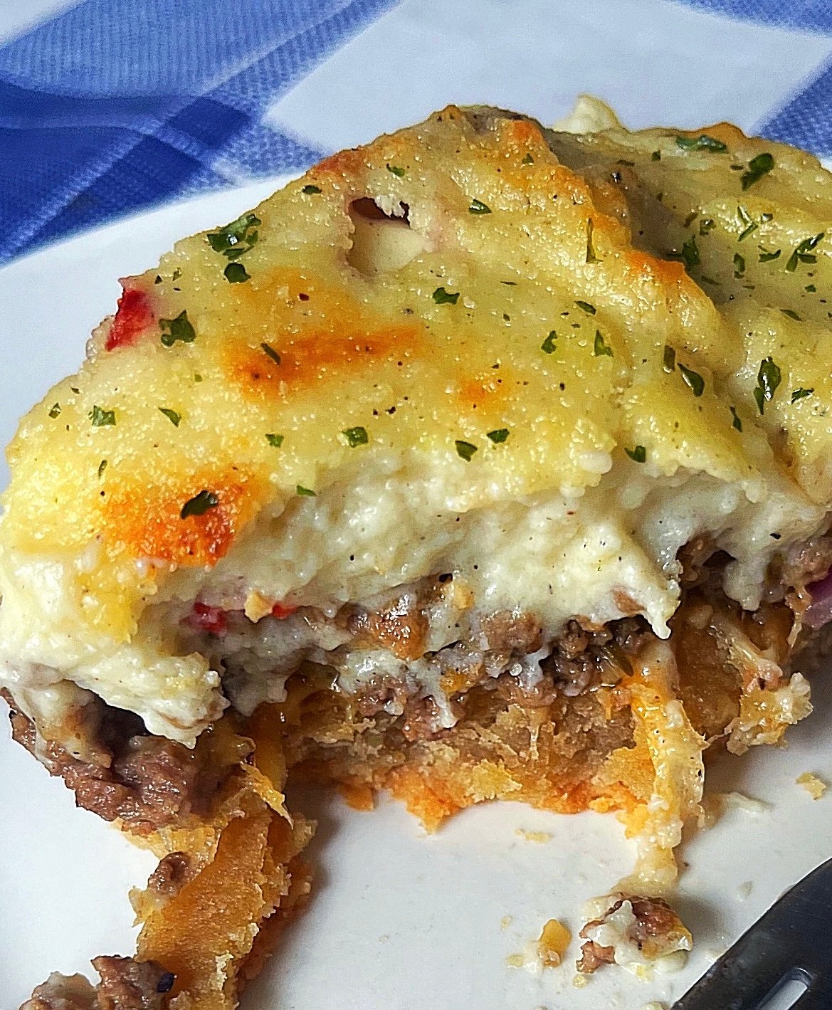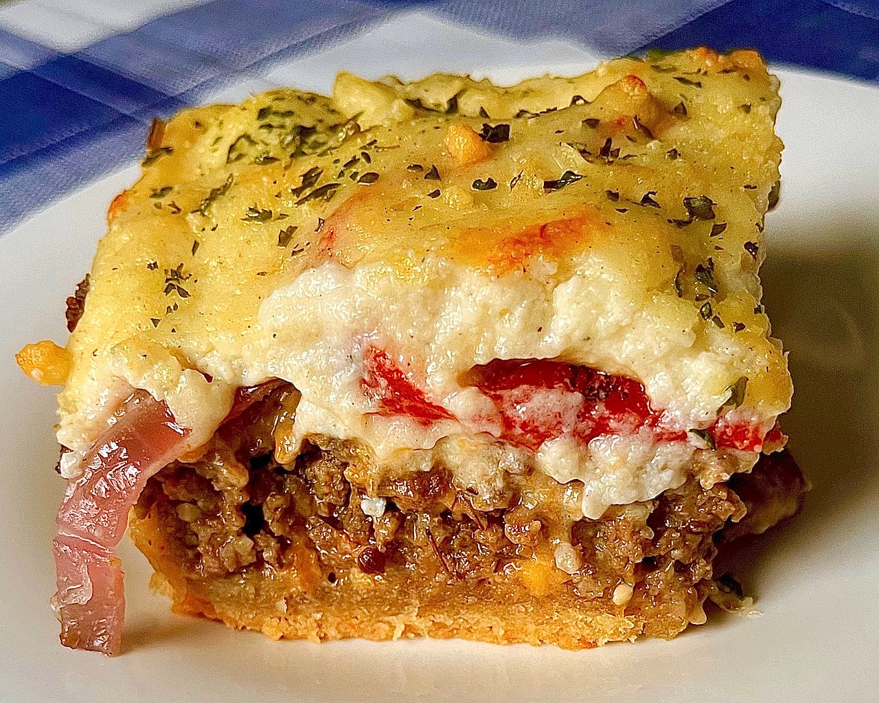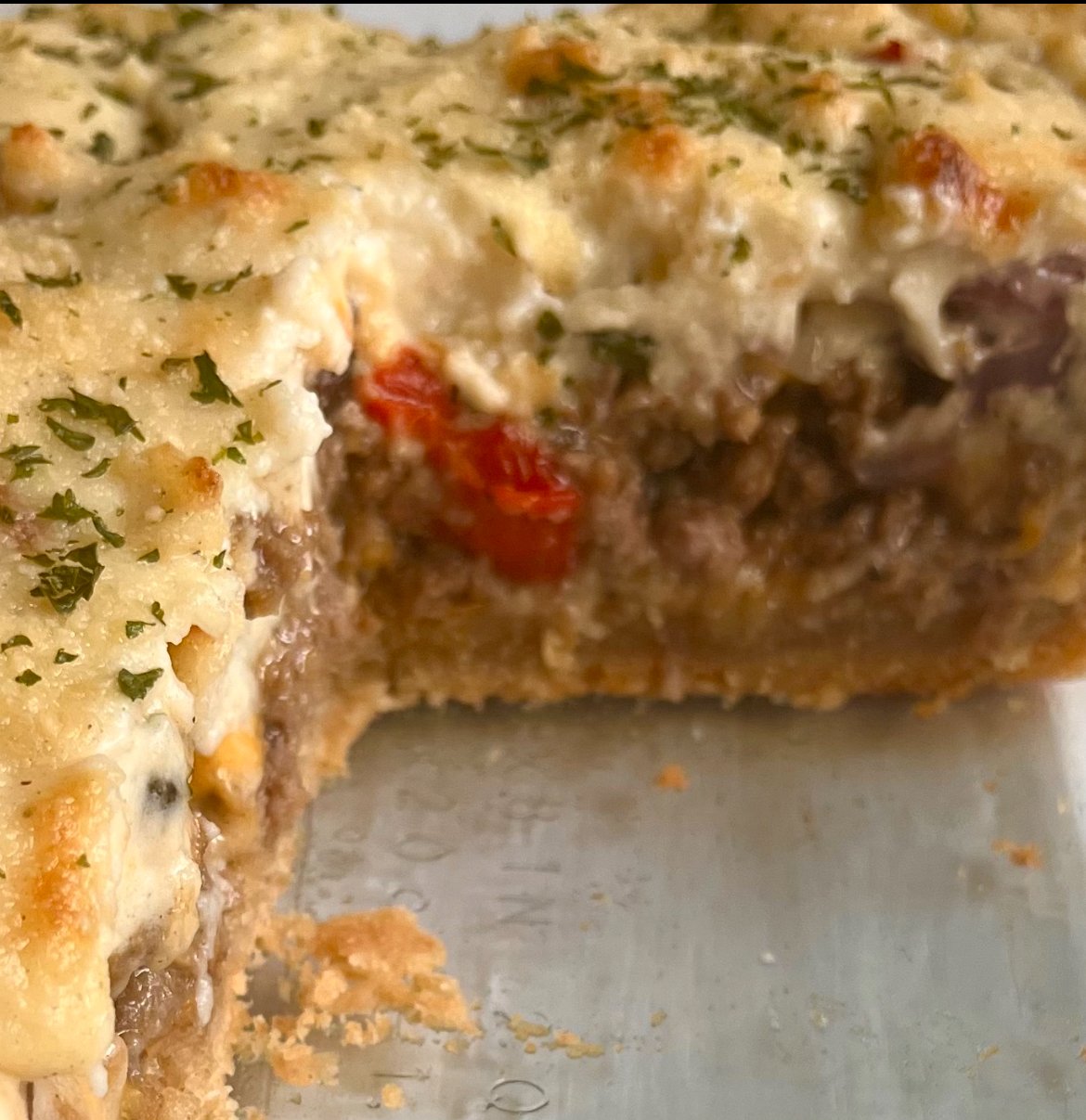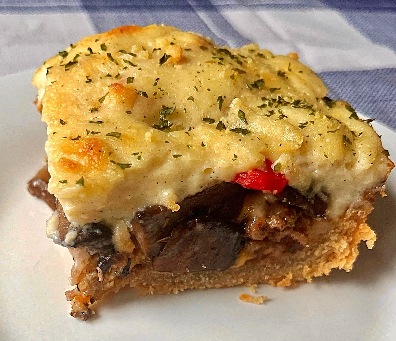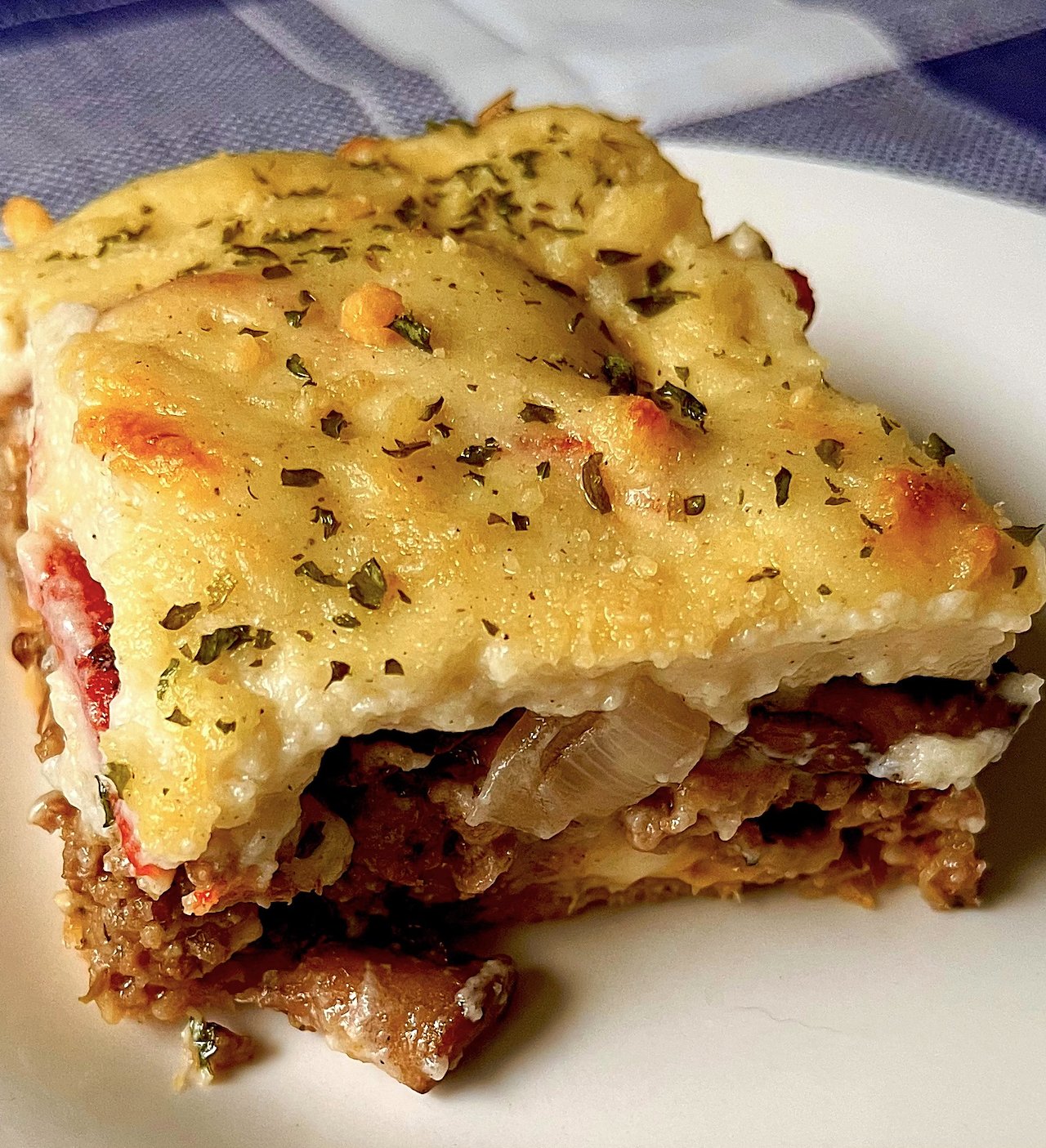 A base of Mom’s ultra-flaky butter crust; a layer of thyme-laced seasoned ground beef; sandwiched between melty Colby-Jack; topped with sautéed mushrooms, melted onions and roasted red peppers; blanketed with a velvety béchamel; and a finishing of parmesan.