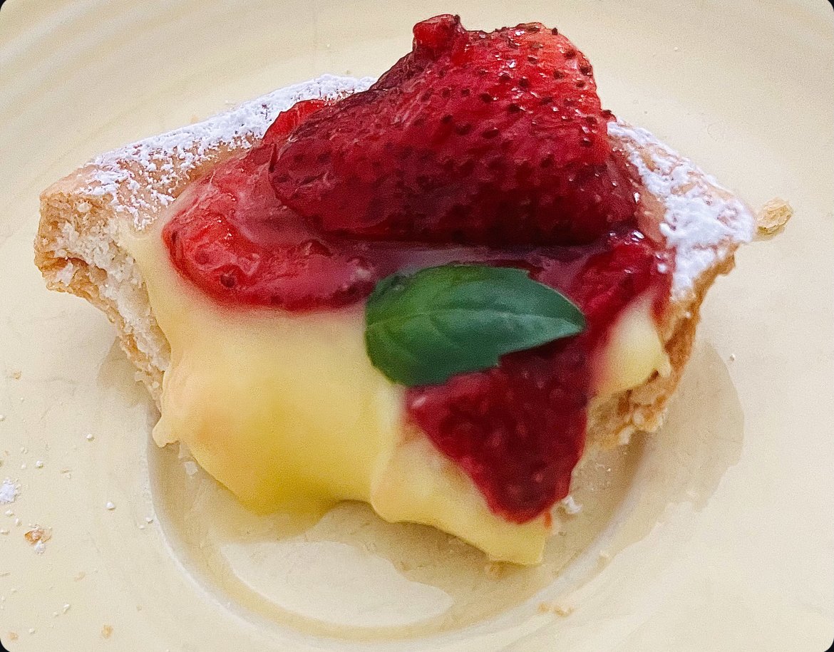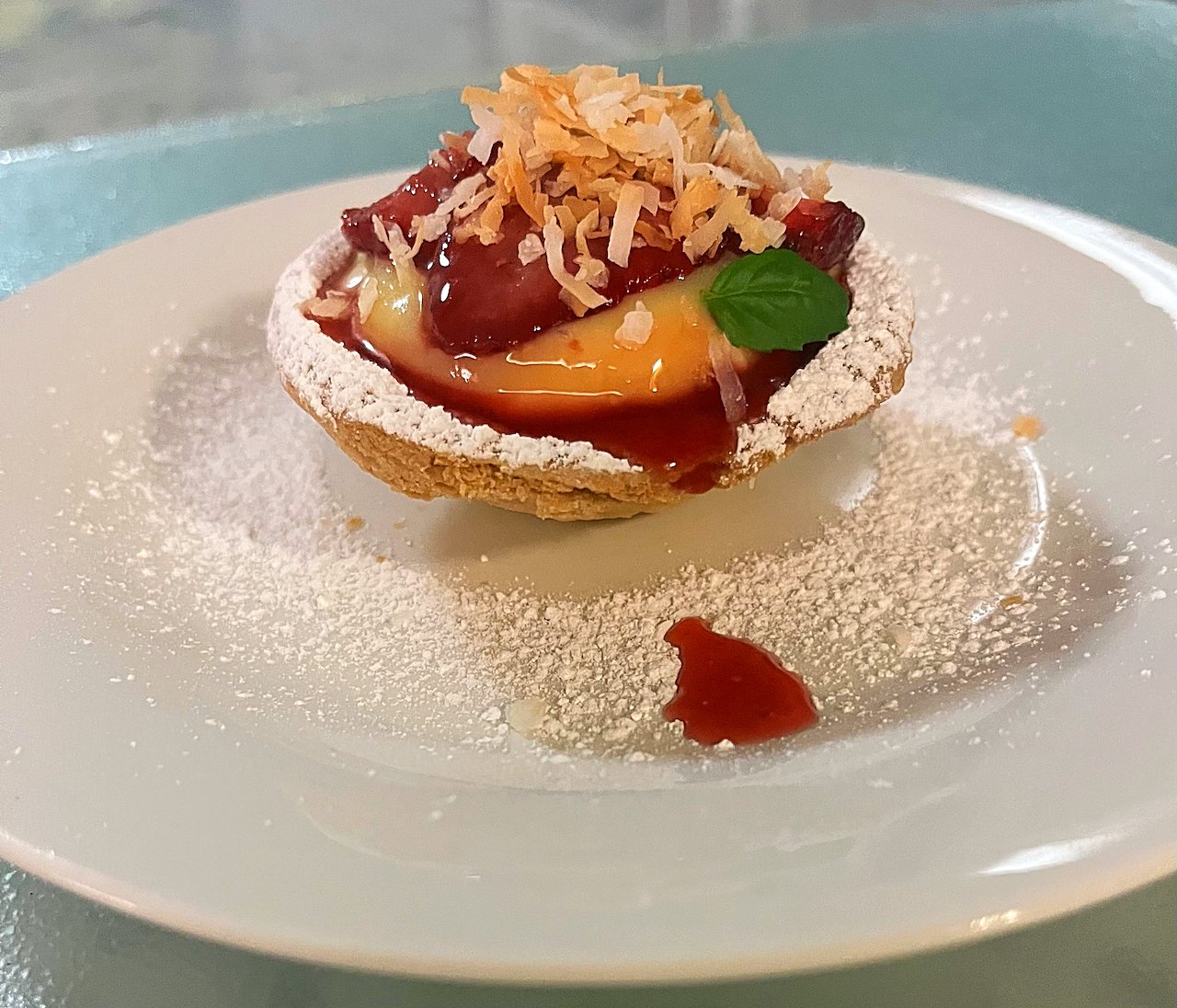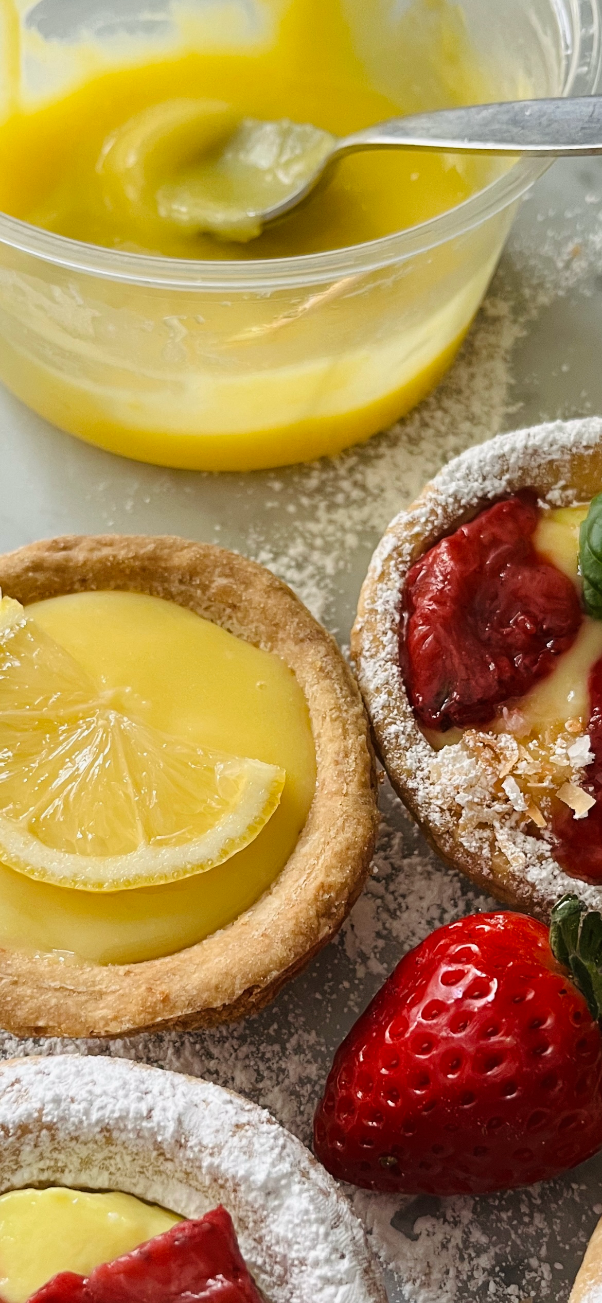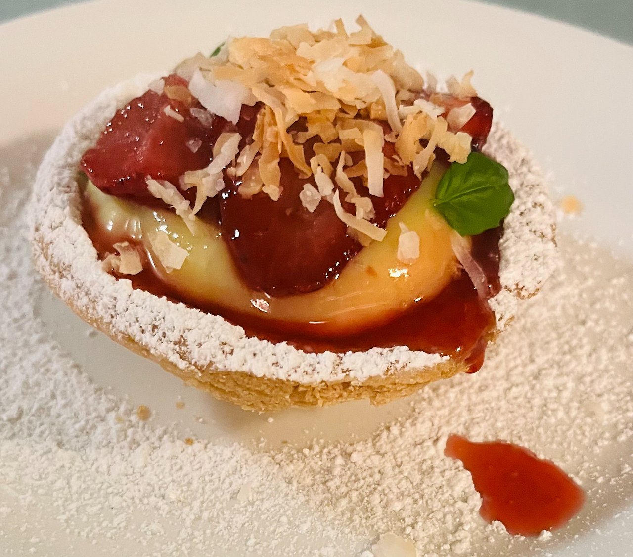 All-butter handmade snappy crust with a vegan vanilla custard kissed with coconut milk, homemade lemon curd layer, roasted maple-vanilla strawberries and toasted coconut.