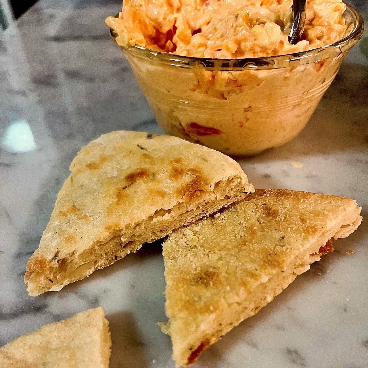 Southern-style flatbread is typically made with an unleavened dough—with ours consisting of 00 bread flour, sea salt, filtered water and herb-infused olive oil, and is cooked directly on a grill or cast-iron griddle. It is coveted for its smoky flavor and slightly charred exterior.
