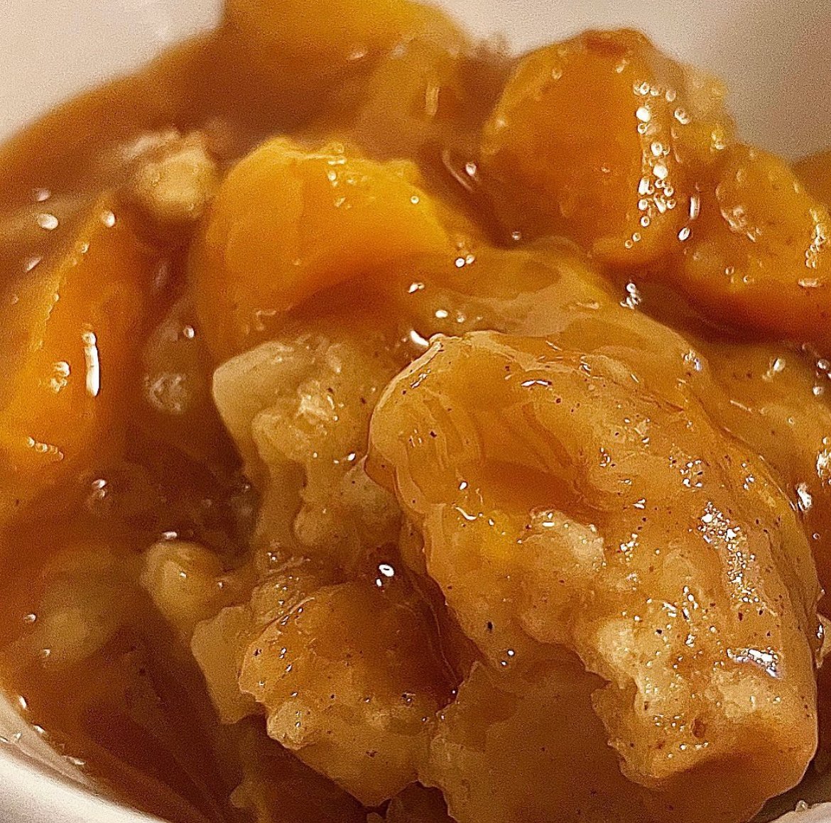 Our buttery Southern peach cobbler is bursting with juicy peaches and is laced with holiday spices, real vanilla and generous peach caramel. 🍑