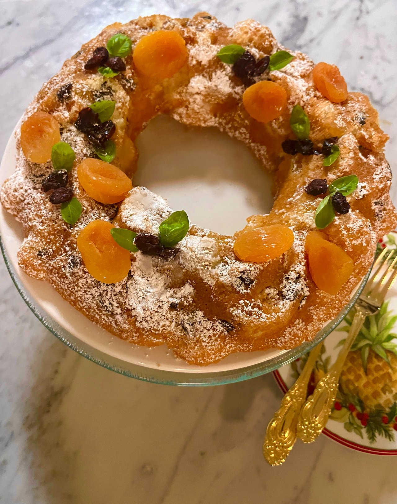 Mom made a festive Southern Christmas wreath bread with dried fruits—including apricots, pineapple, raisins and cranberries—laced with apricot brandy.