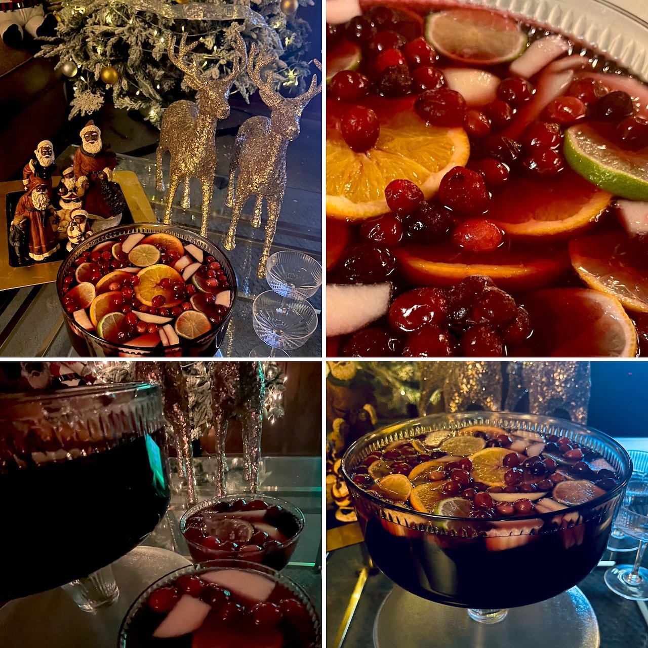 Ours is brimming with sparkling Lambrusco, cranberry juice, pomegranate syrup, apricot brandy, ginger ale, sliced citrus (lemon, lime and orange) and pears, frozen cranberries and cinnamon sticks.