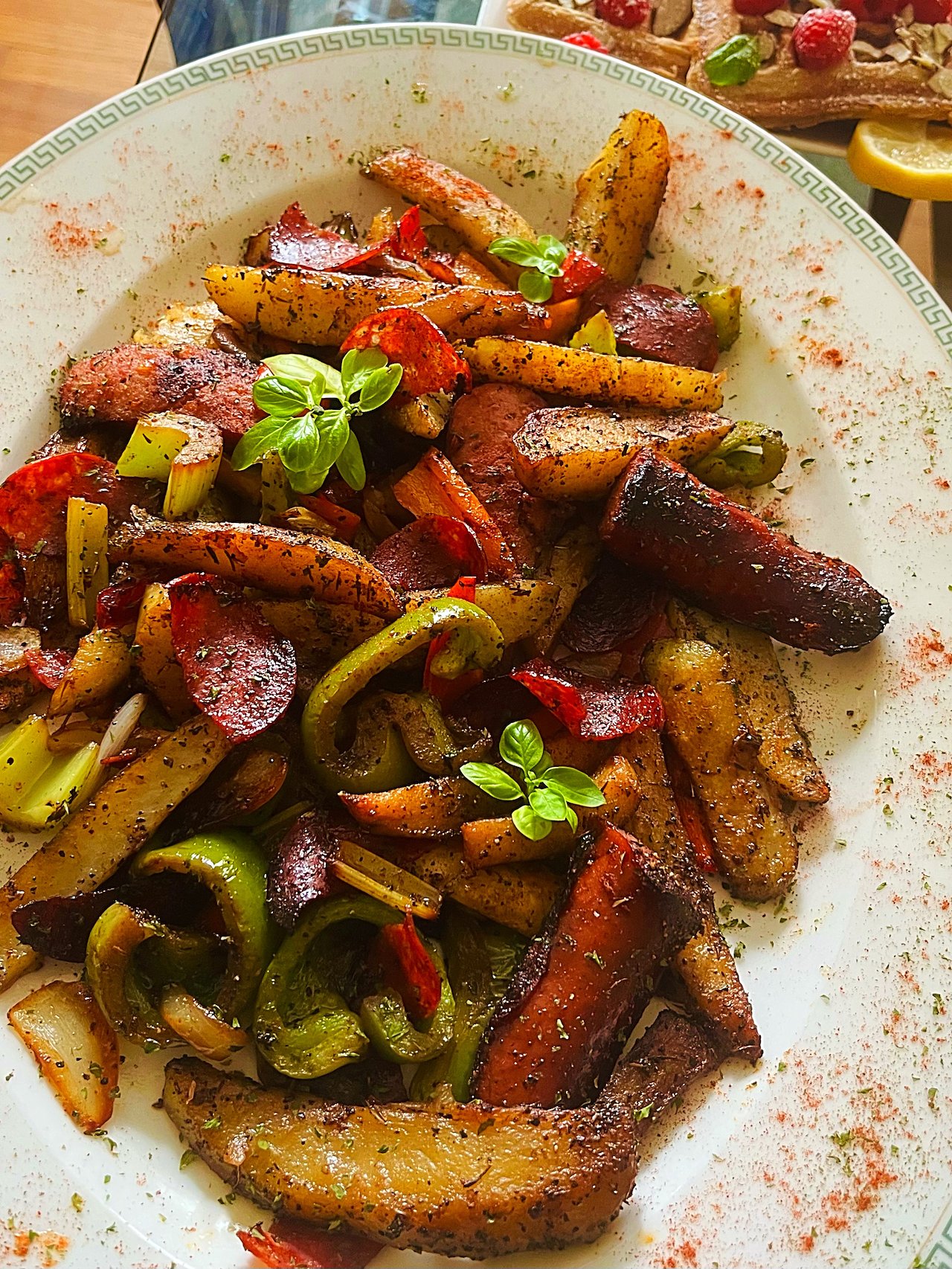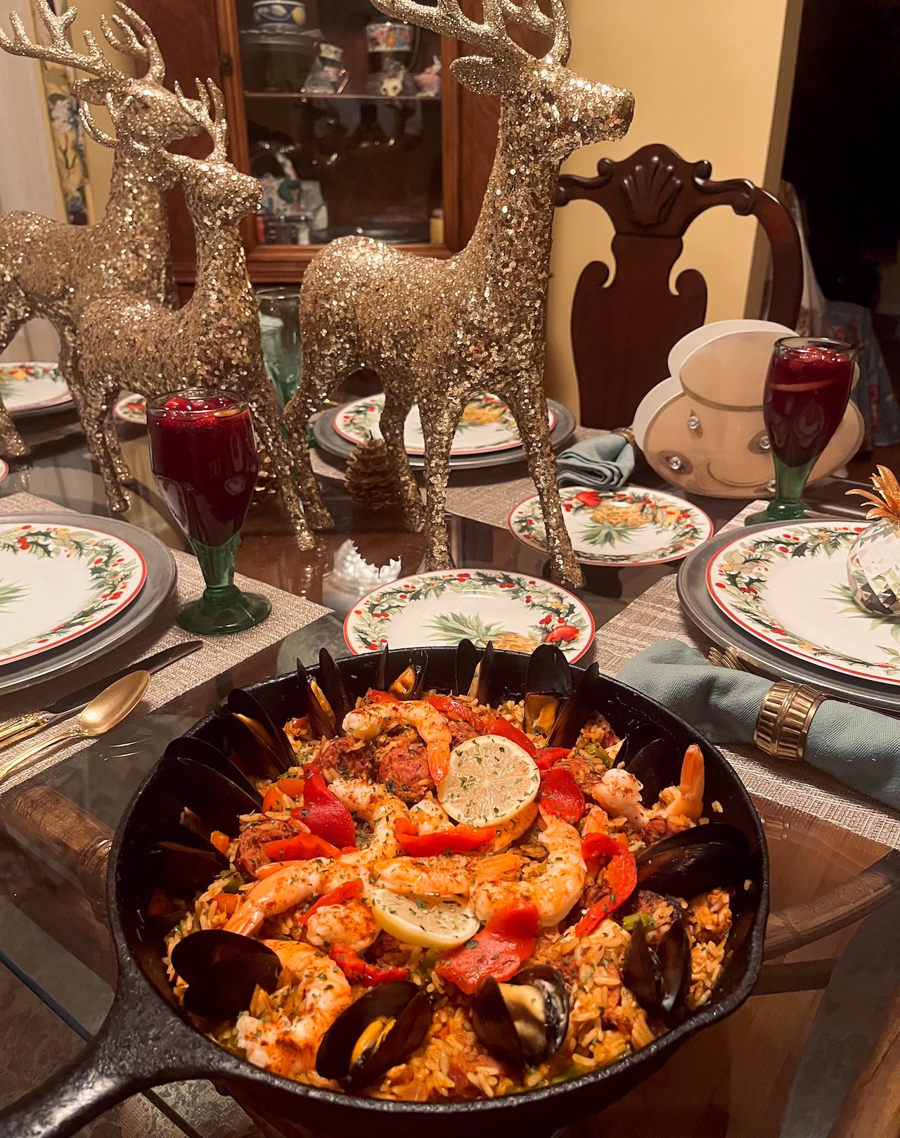 Juicy marinated chicken and shrimp, spicy #chaurice and garlicky mussels as well as the holy trinity (onions, bell peppers and celery) and roasted peppers studded this Creole-style creation lovingly made in my nana’s well-seasoned cast-iron skillet; fire-roasted tomatoes and smoked paprika made a glorious broth.