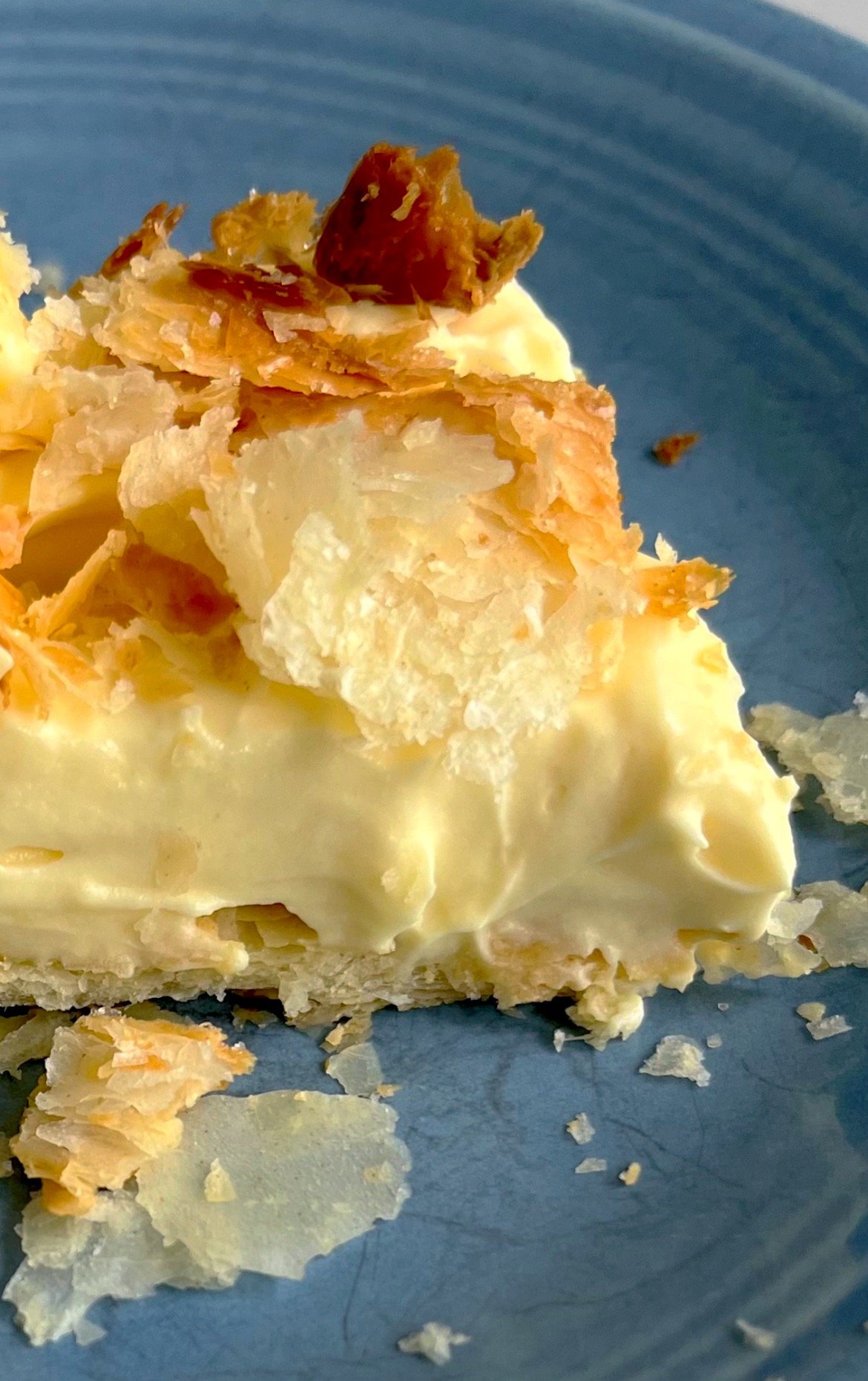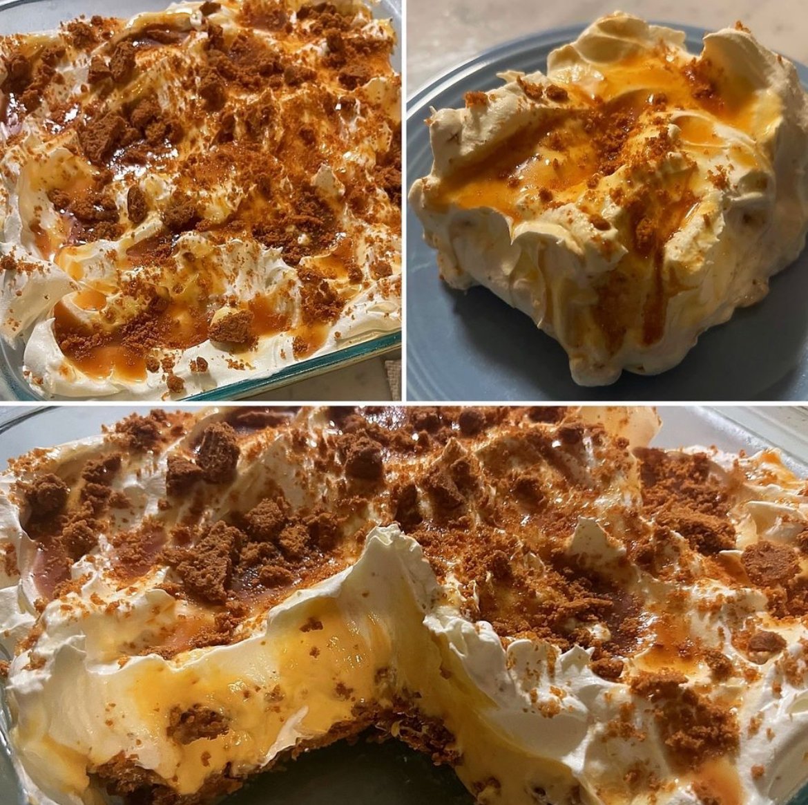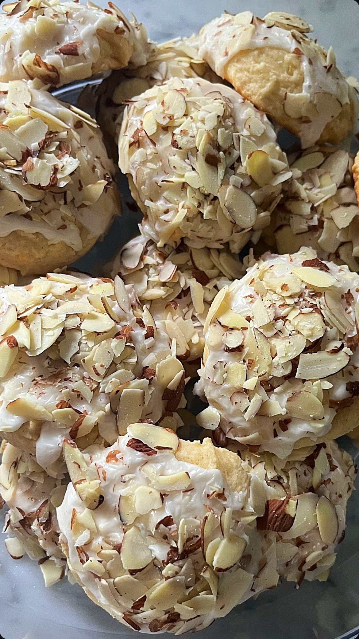 Two layers of Southern brown sugar caramel cake, each brushed with sweet bourbon syrup, then a layer of homemade milk jam (aka milk caramel or dulce de leche), a schmear of whipped Creole cream cheese, enrobed in silky Creole cream cheese frosting, a generous milk jam drip on the top and bottom and a crown of sliced almonds, served chilled.