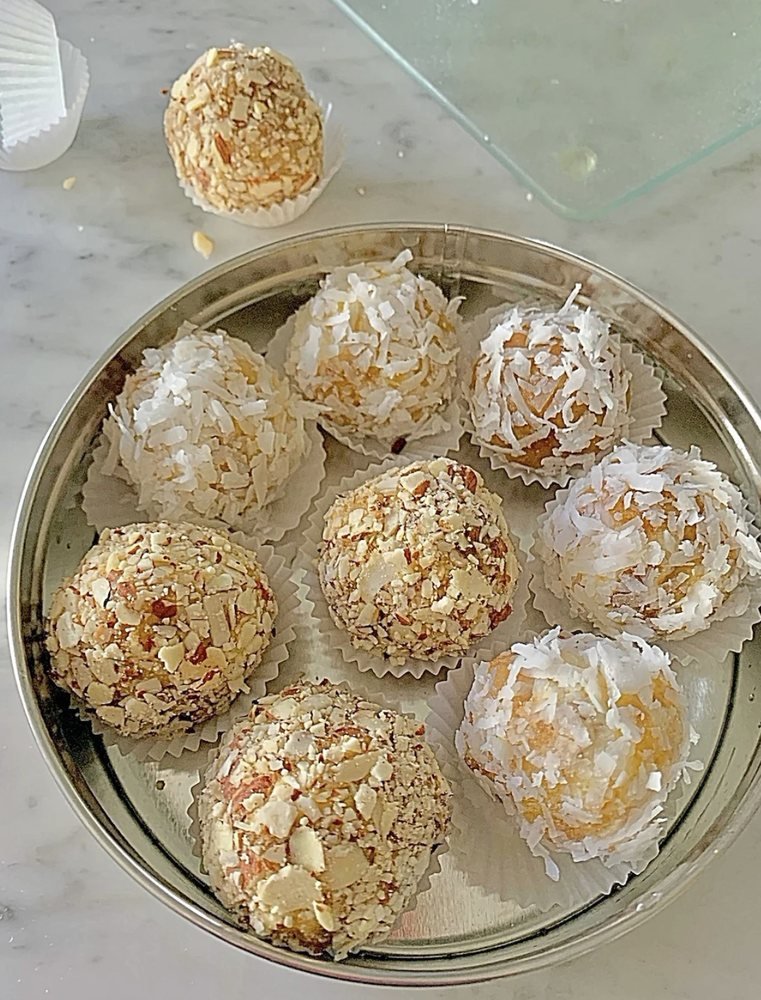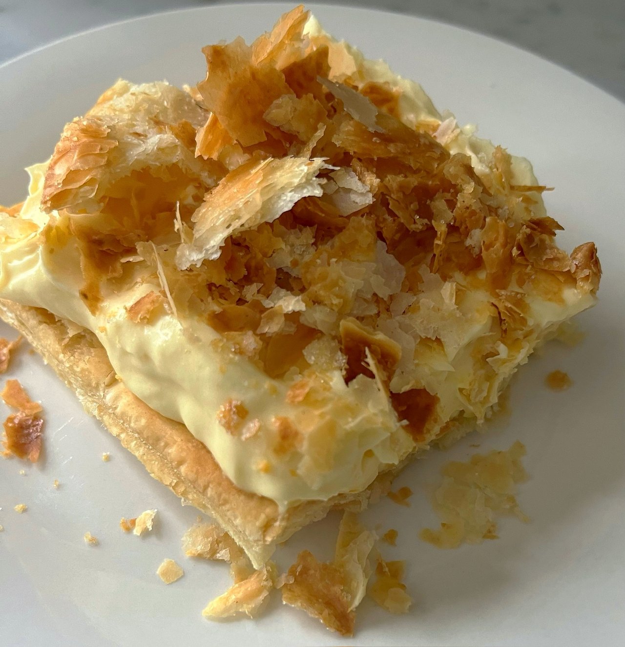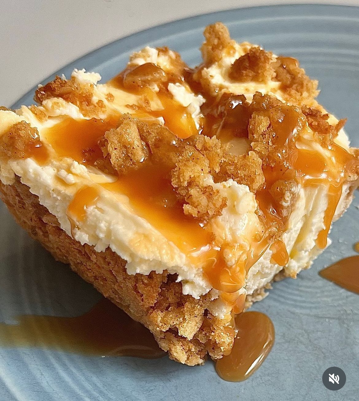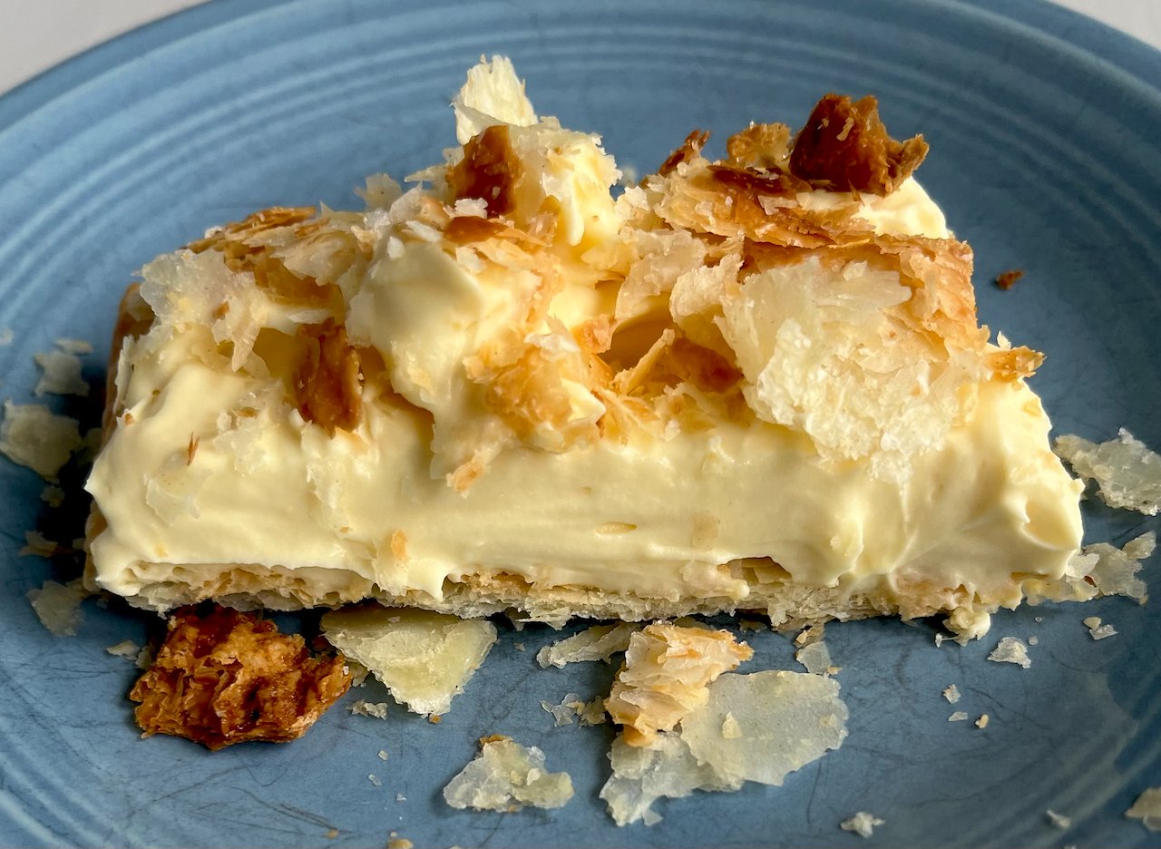Two layers of Southern brown sugar caramel cake, each brushed with sweet bourbon syrup, then a layer of homemade milk jam (aka milk caramel or dulce de leche), a schmear of whipped Creole cream cheese, enrobed in silky Creole cream cheese frosting, a generous milk jam drip on the top and bottom and a crown of sliced almonds, served chilled.