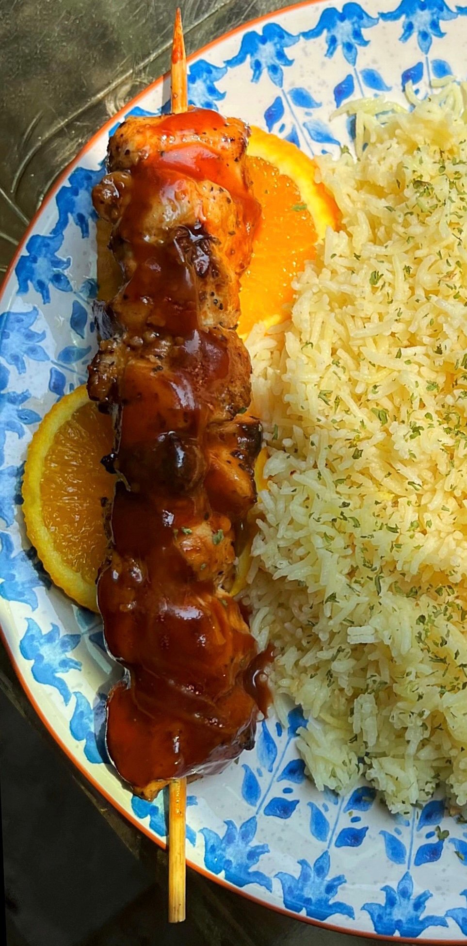 Fresh Orange BBQ Chicken Skewers Plate served with savory basmati rice and That Coleslaw