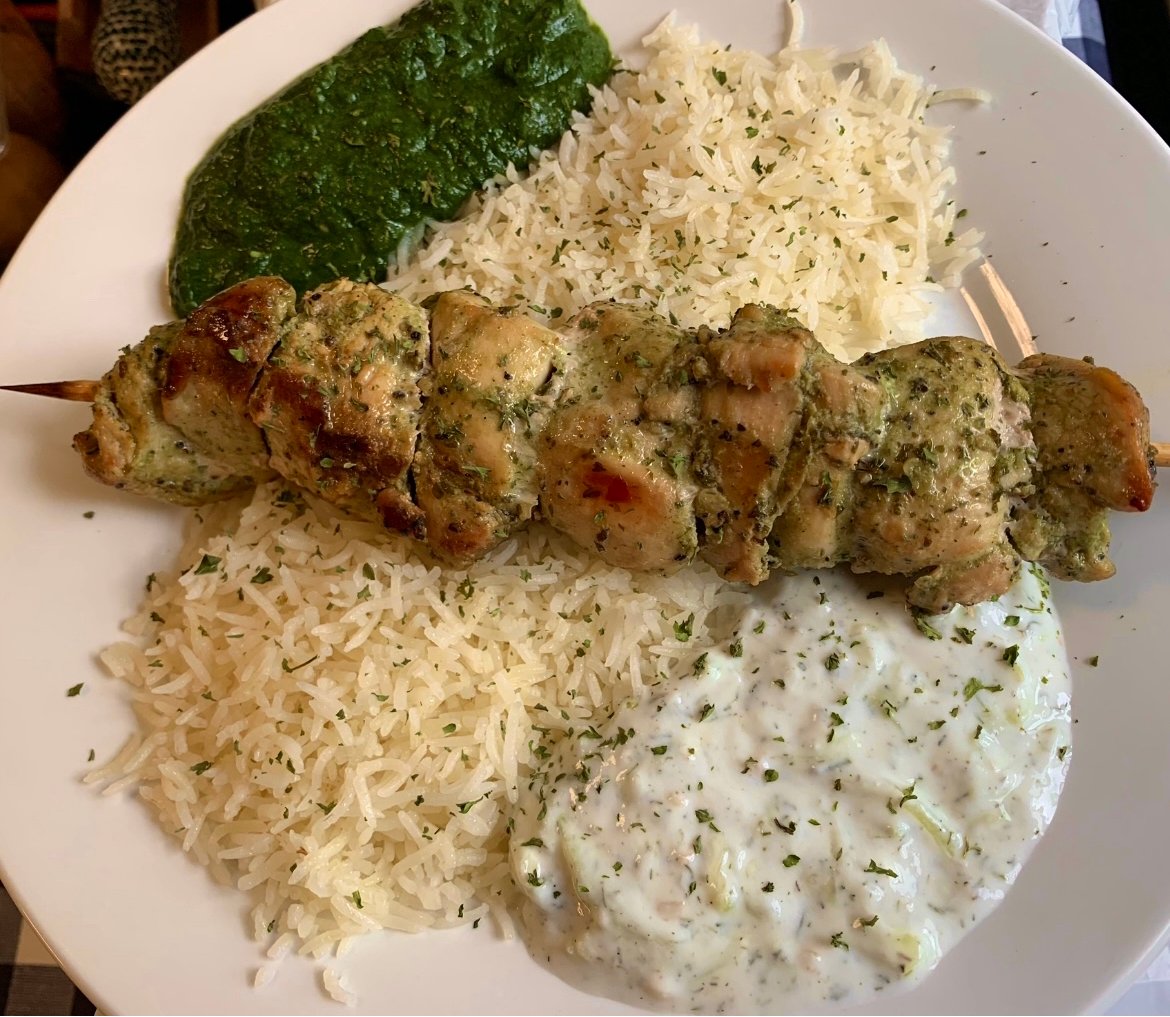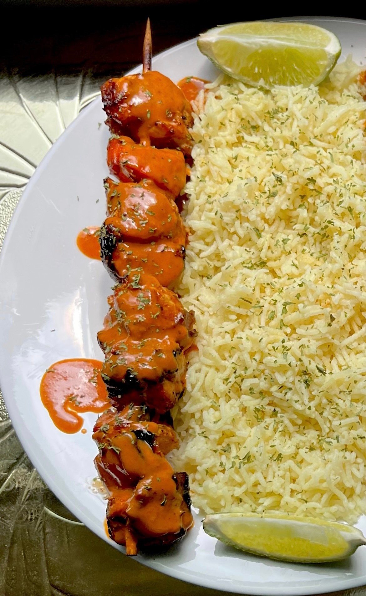 Peri-Peri Chicken Espetadas Plate with skewered veggies (sweet peppers, red onions, zucchini and yellow squash) served with savory basmati rice and a side of our creamy lemon-dill aioli