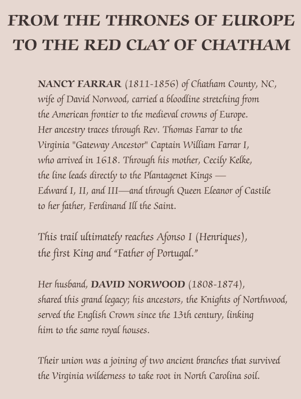 The Father of Portugal is my paternal ancestor by way of my aristocratic 3rd great-grandparents, David Norwood and Nancy Farrar, both of whom directly descended from Afonso I.