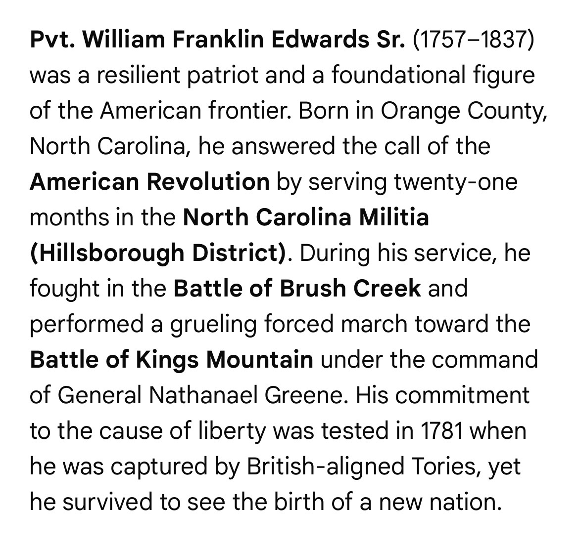 My direct paternal ancestor, William Franklin Edwards, was a veteran of the American Revolution; he served four different tours of duty.