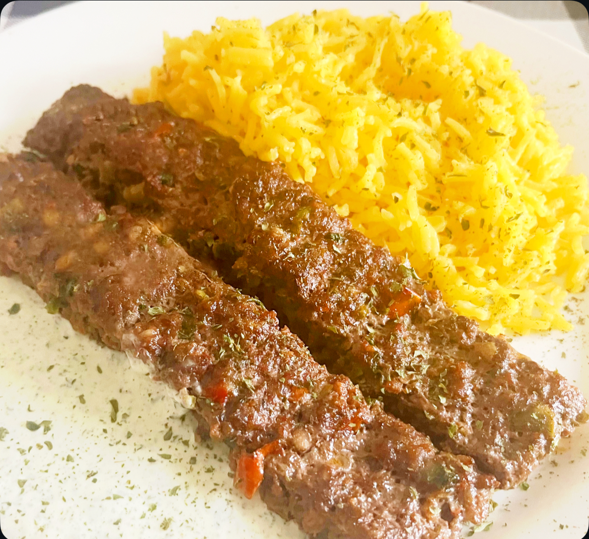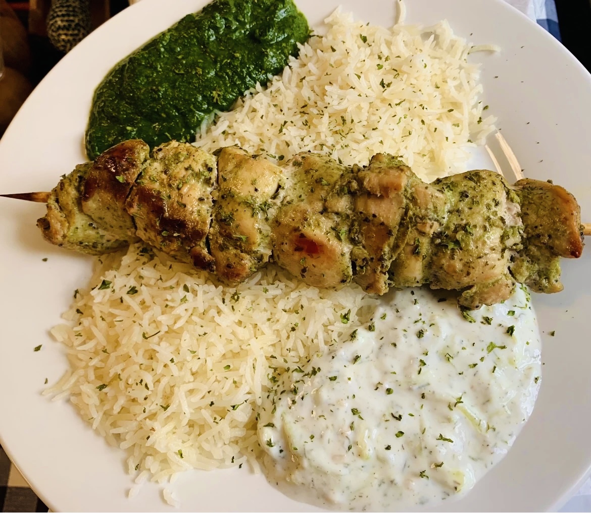 Peri-Peri Chicken Skewer Plate with skewered veggies (sweet peppers, red onions, zucchini and yellow squash) served with savory basmati rice and a side of our creamy lemon-dill aioli